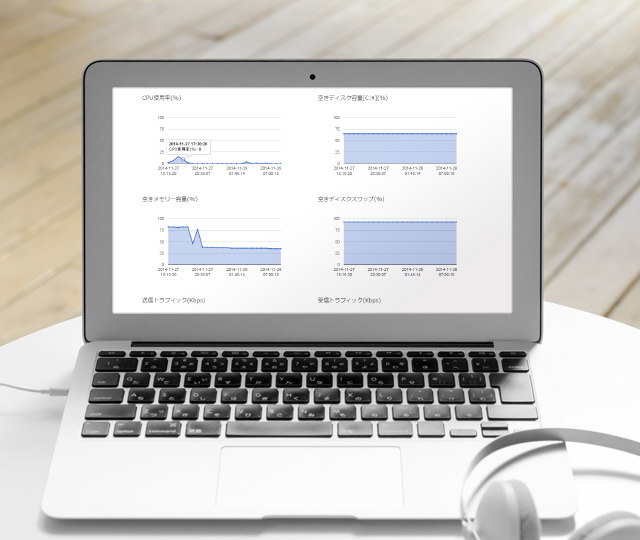 監視対象のサーバーへエージェントを導入することで、CPU使用率、HDD利用率、空きスワップサイズ、通信トラフィック量等のパフォーマンス メトリクスをモニタリングすることが可能になります。エージェントが取得した値はグラフ化され管理画面から確認ご確認頂けるほか、サービス監視と同様にアラート通知を行う事が出来ます。